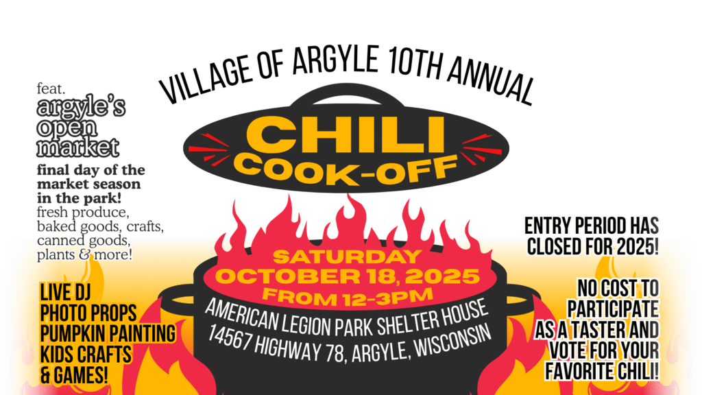 Join us this year for the 10th Annual Chili Cook-Off featuring the Argyle’s Open Market’s last day of the season!